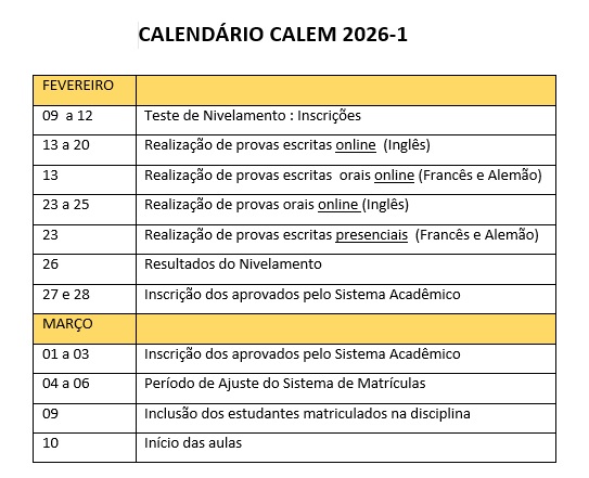 O Centro Acadêmico de Línguas Estrangeiras Modernas (CALEM) oferece cursos de três idiomas: AlemãoFrancês e Inglês. Dividimos o aprendizado desses idiomas em 5 níveis, do iniciante ao pré-intermediário, e cada nível possui duração de um semestre.