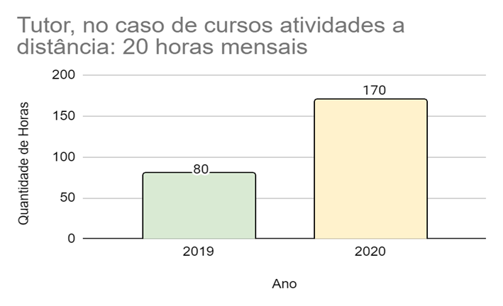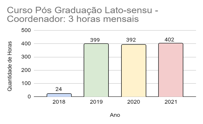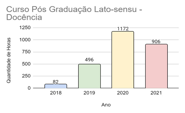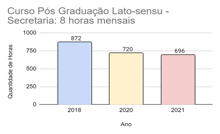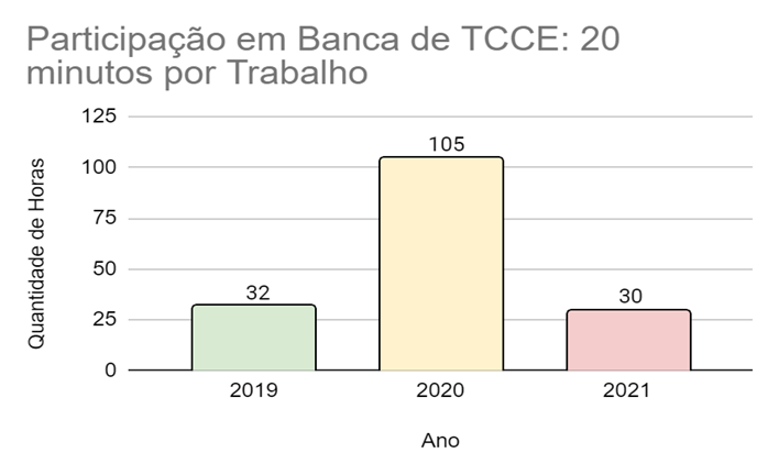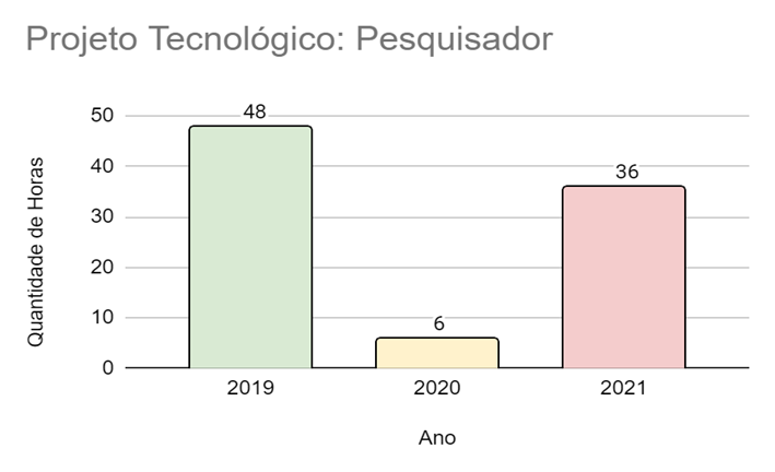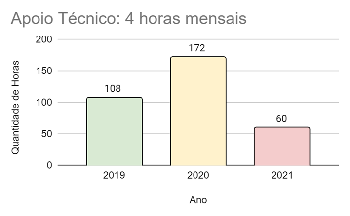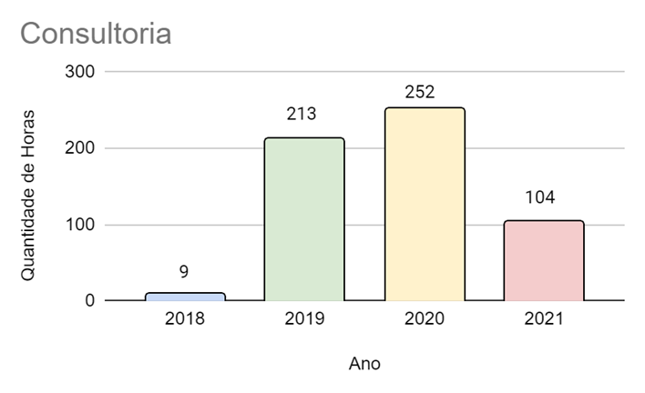 De acordo com o tipo de atividade desempenhada é possível observar dados que demonstram a realidade de acordo, inclusive, com a situação da Pandemia enfrentada. No apoio técnico, por exemplo, houve um aumento nas horas trabalhadas de 2019 para 2020 e uma redução para 2021. Nas atividades esporádicas também ocorreu um aumento de 2019 para 2020 e uma queda de 2020 para 2021. O mesmo ocorreu, de forma menos drástica, com as consultorias. Essa realidade é diferente para as atividades de coordenação, que se mantiveram equilibradas após grande crescimento de 2018 para 2019.