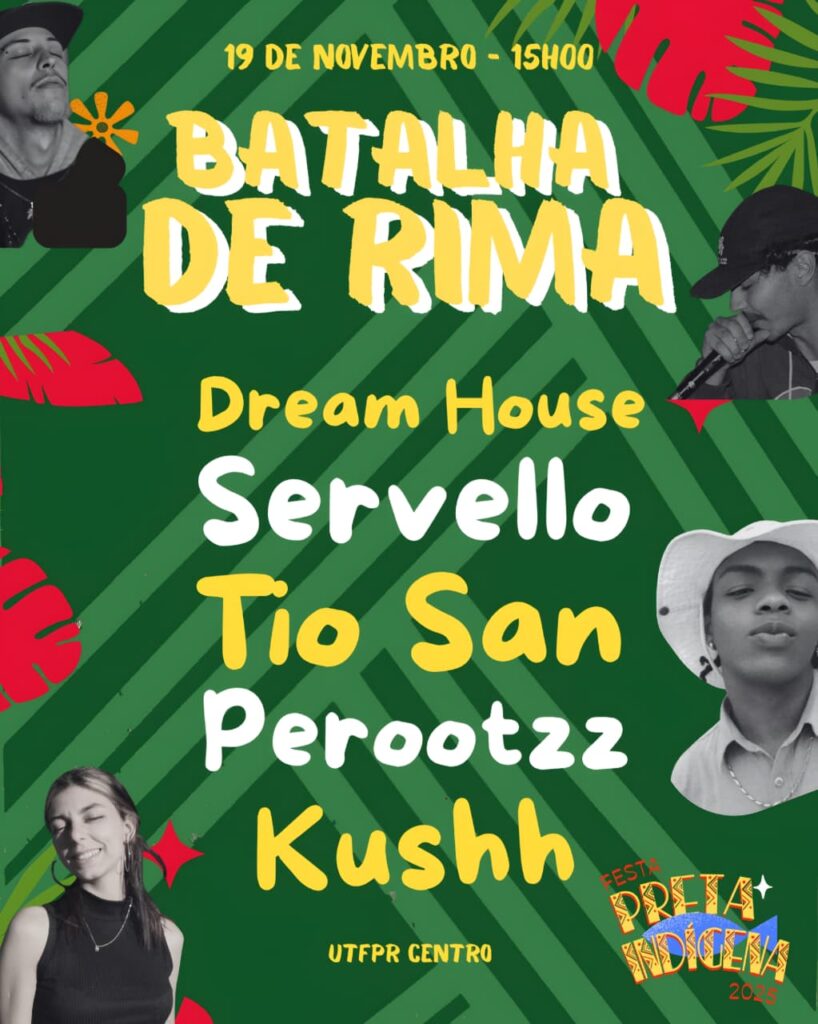 A Festa Preta-Indígena 2025 abre espaço pro verdadeiro pulso da quebrada: uma Batalha de Rima que chega pra incendiar o campus com muita arte, flow, improviso e identidade. A cultura hip hop toma conta da UTFPR às 15h, trazendo MCs que carregam vivência, consciência e ritmo na ponta da língua. É rima atravessando corpo, território, resistência e criatividade — tudo no improviso, tudo no calor do momento, tudo pra arrepiar quem colar.