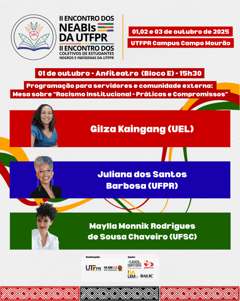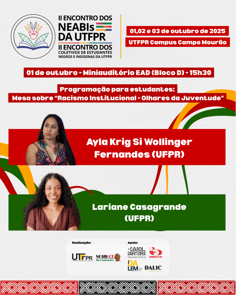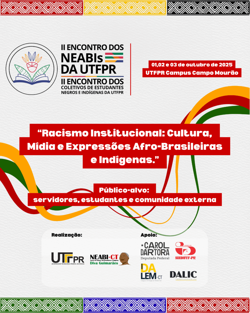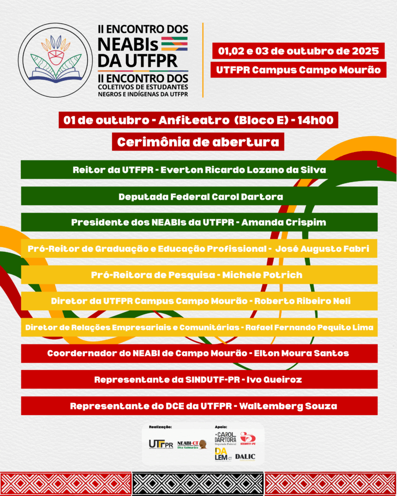 AçõesEventosExtensão II Encontro dos NEABIs da UTFPR / II Encontro dos Coletivos de Estudantes Negros da UTFPR (Campo Mourão, 2025) 24 de setembro de 2025 wdpincerati Para maiores informações, clique aqui. .