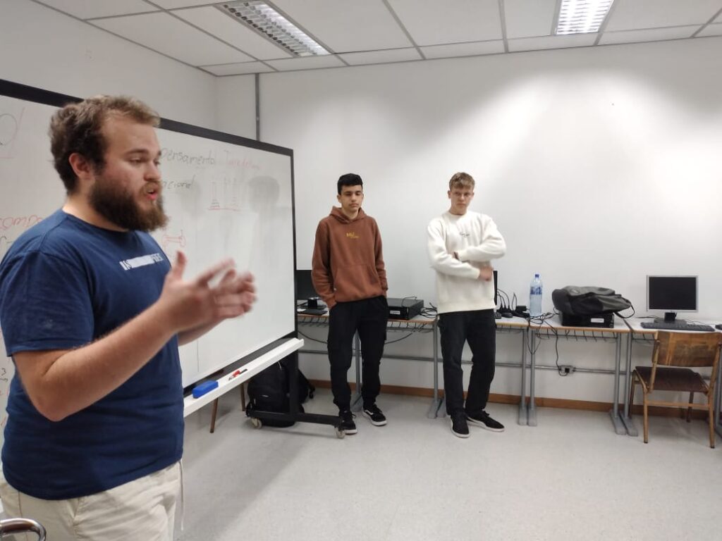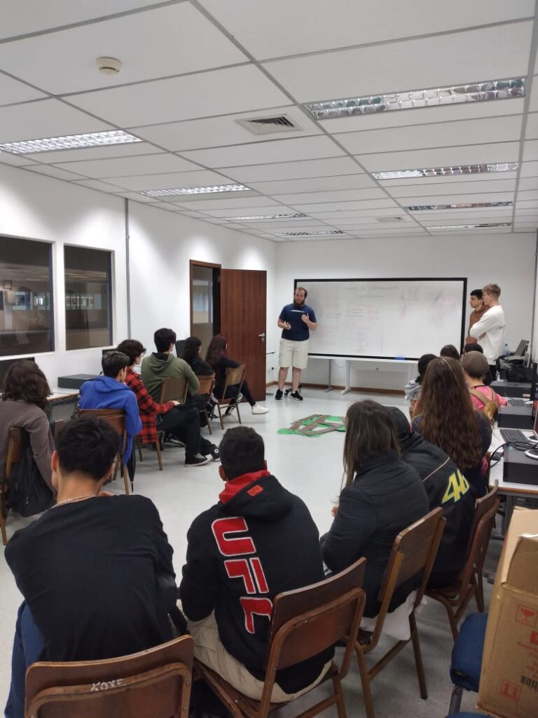 Os instrutores do PETECO, Vinicius, Arthur Dal Bem e Arthur Pelegrini mostraram os pilares do pensamento computacional: decomposição de problemas, abstração de características que não influenciam na solução, reconhecimento de padrões na solução projetada e criação de algoritmos.