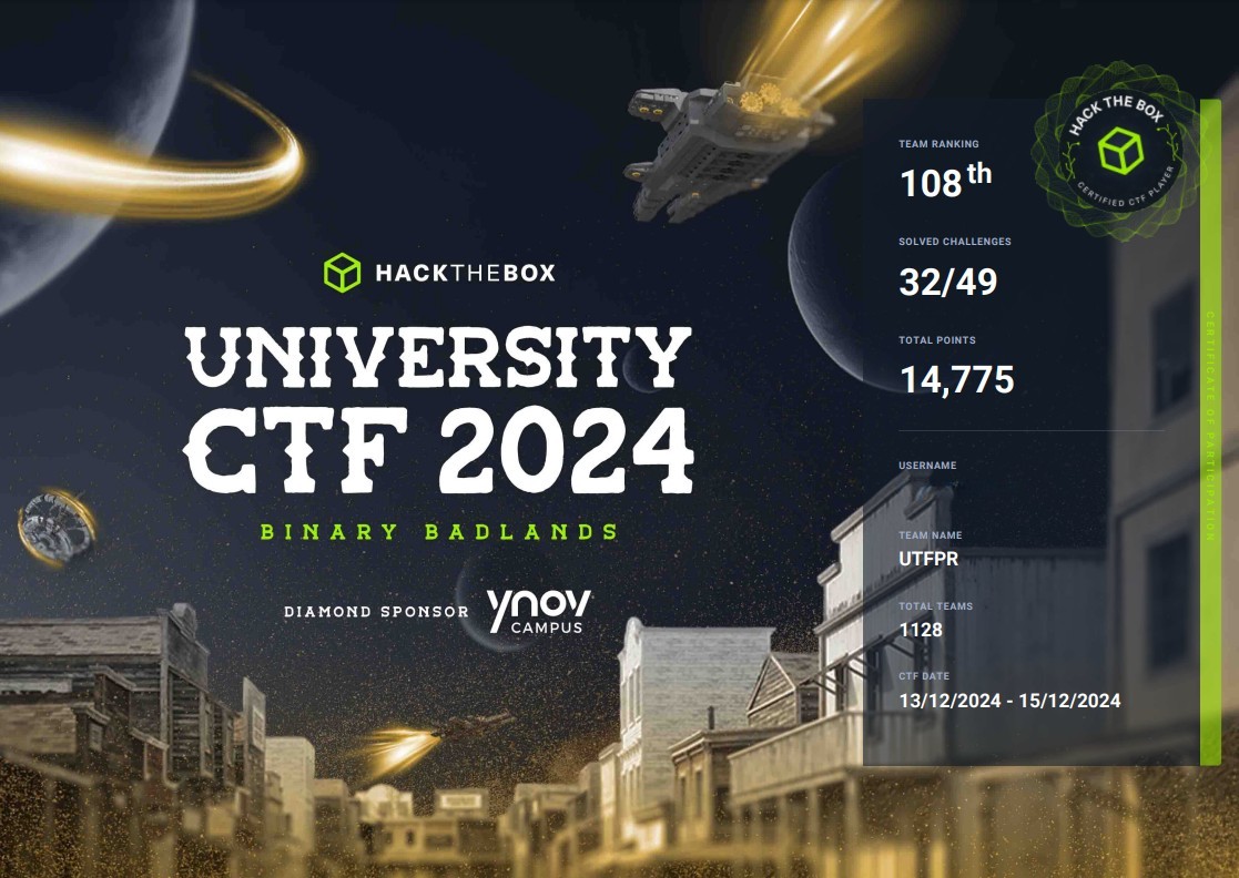 Dias após a concepção da equipe, nós tivemos a oportunidade de representar a UTFPR na nossa primeira competição de Capture the Flag ou CTF, o University CTF 2024: Binary Badlands da plataforma HackTheBox, que aconteceu entre os dias 13 e 15 de Dezembro. O evento contou com 49 flags, que […]